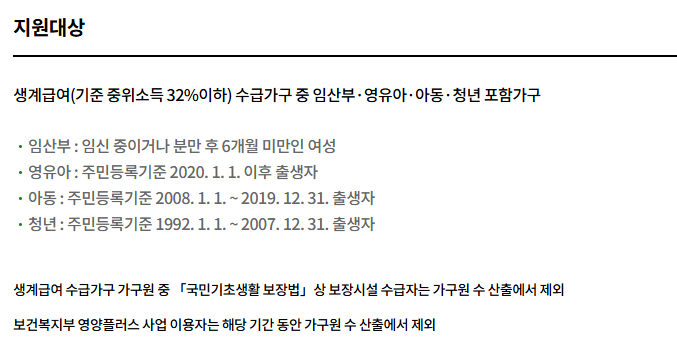 - 생계급여(기준 중위소득 32%이하)